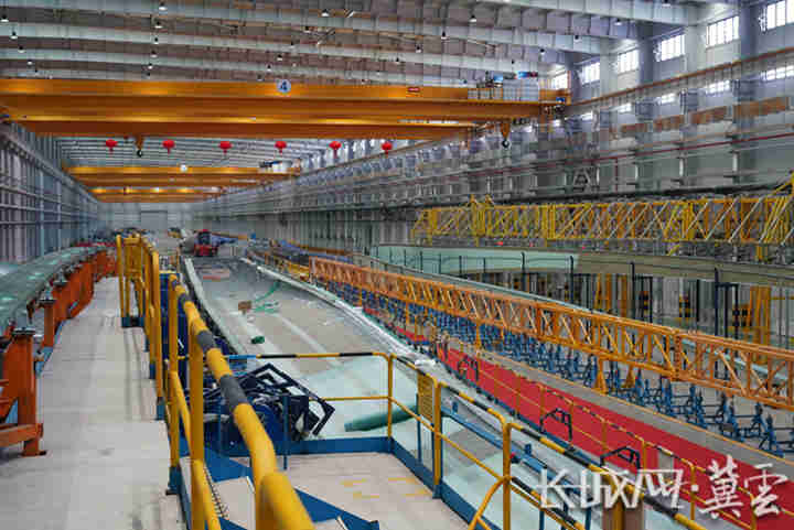 在总长690米、宽108米的巨型厂房内,工人们正在进行风电叶片的生产、吊装和转运工作,智能化生产线全速高效运转。